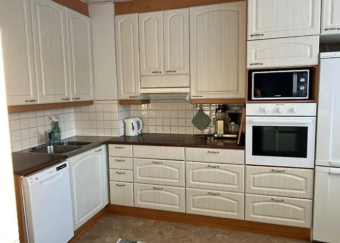 La cucina completamente attrezzata è completa di servizi per la preparazione di tè/caffè, oltre a un microonde, un frigo e una vetreria, indispensabili per cucinare da soli. Quest'alloggio è abbastanza vicino alla stazione degli autobus Korpintie ii I.